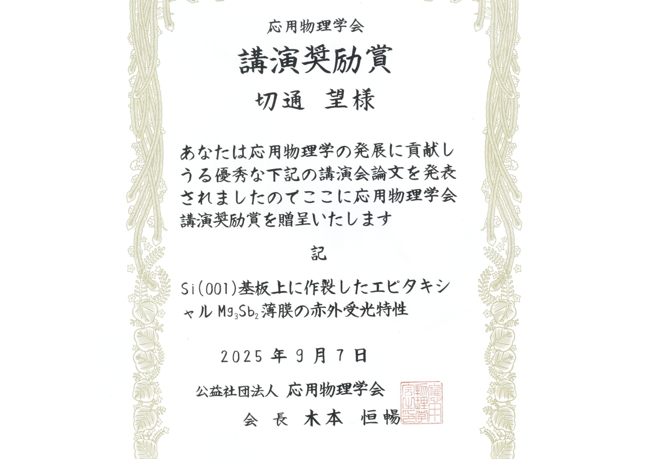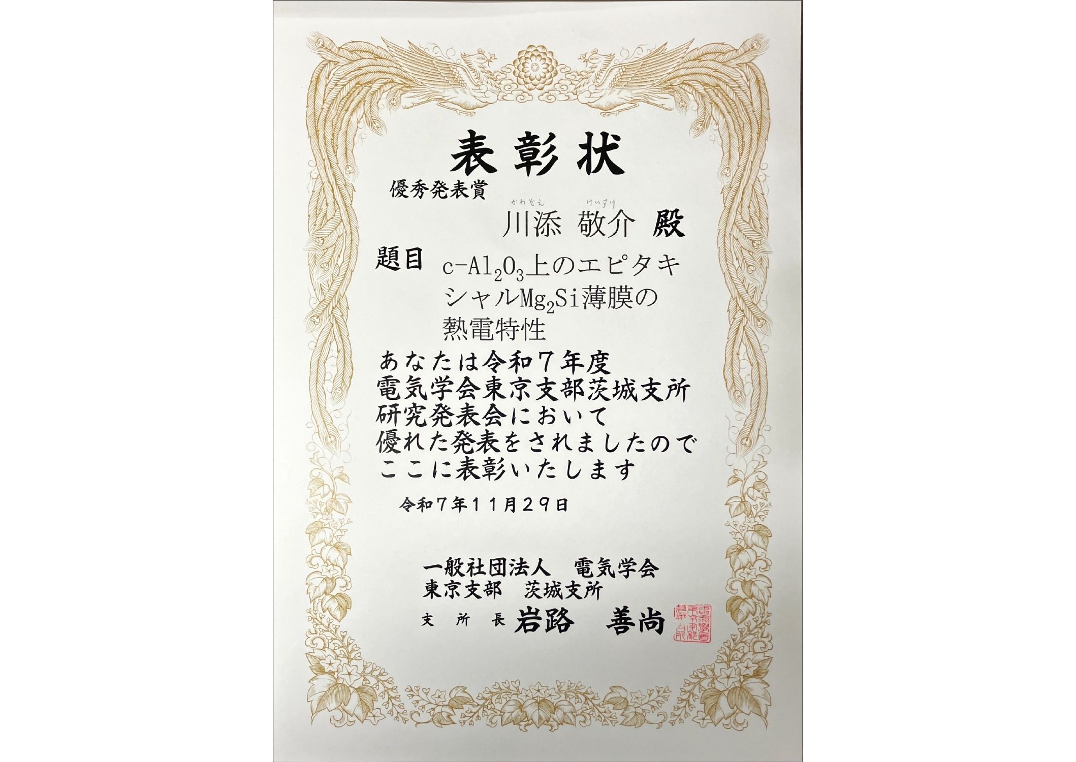 優秀発表賞(ポスター発表部門)"c面サファイア上のエピタキシャルマグネシウムシリサイド薄膜の熱電特性" 川添敬介 令和7年度 第33回 茨城支所 研究発表会 |