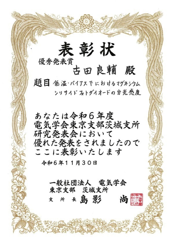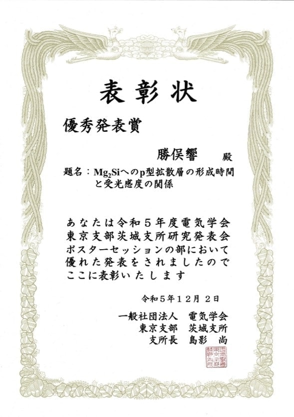 優秀発表賞(ポスター部門)低温・バイアス下におけるマグネシウムシリサイドフォトダイオードの分光感度 2024年11月30日 令和6年度電気学会東京支部茨城支所研究発表会 |