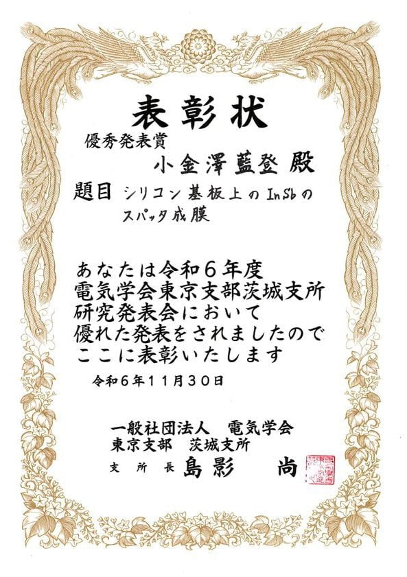 優秀発表賞(ポスター部門)シリコン基板上のInSbのスパッタ成膜 小金澤藍登(久保田啓聖、鮎川瞭仁、坂根 駿也、鵜殿 治彦) 2024年11月30日 令和6年度電気学会東京支部茨城支所研究発表会 |