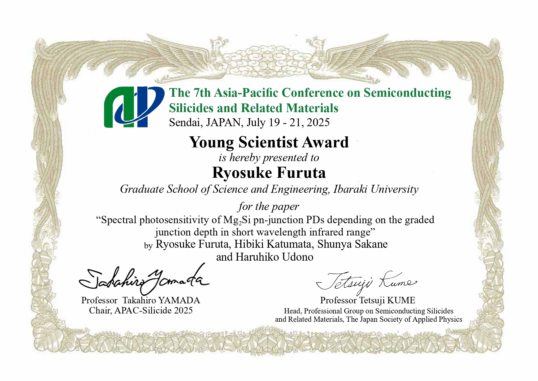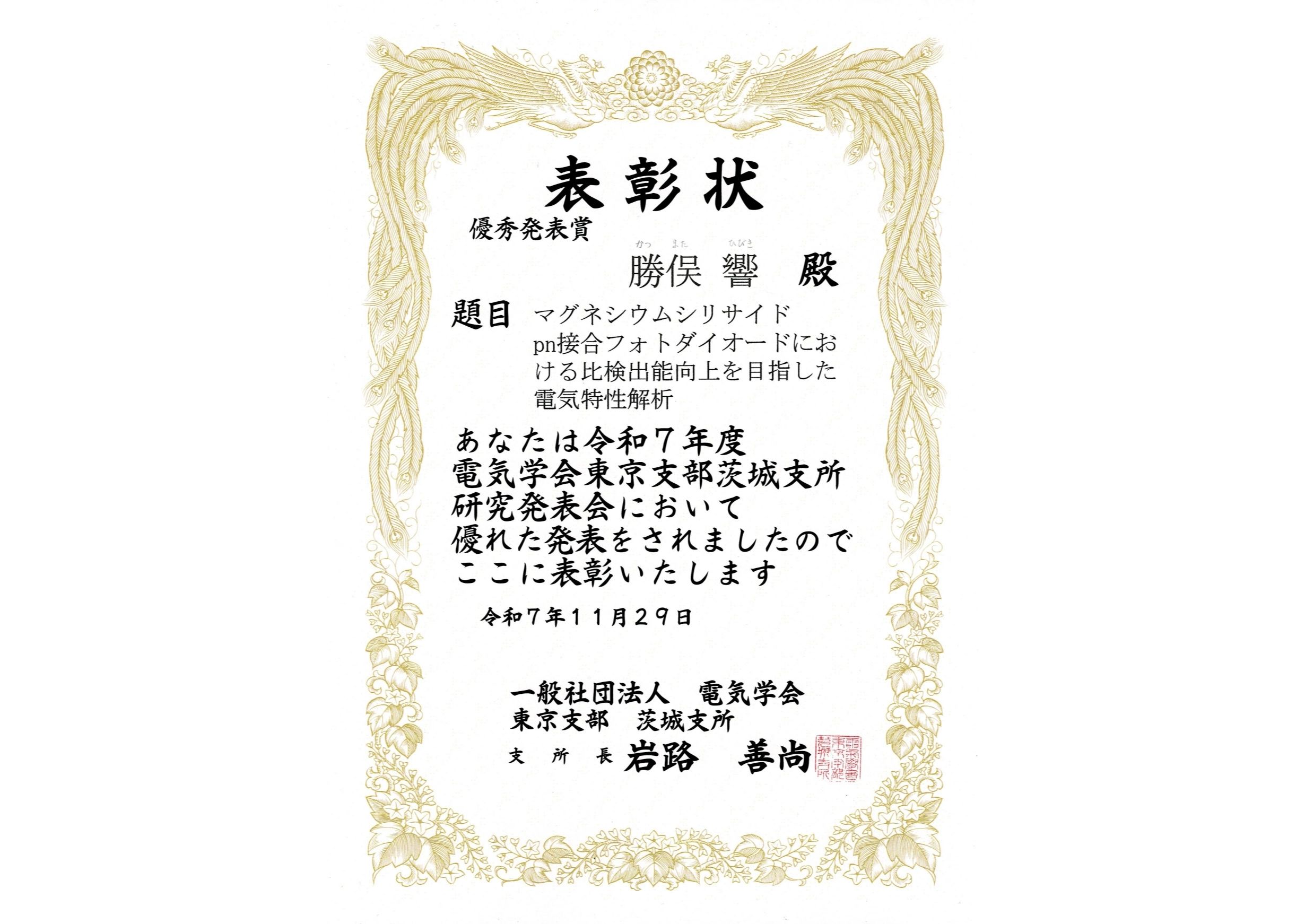 優秀発表賞(口頭発表部門)"マグネシウムシリサイドpn接合フォトダイオードにおける比検出能向上を目指した電気特性解析" 勝俣 響(勝俣 響,古田良輔,関口英紘,長谷川翔吾,清水匠,鉄幸多朗,島野航輔,坂根駿也,鵜殿治彦) 令和7年度 第33回 茨城支所 研究発表会 |
