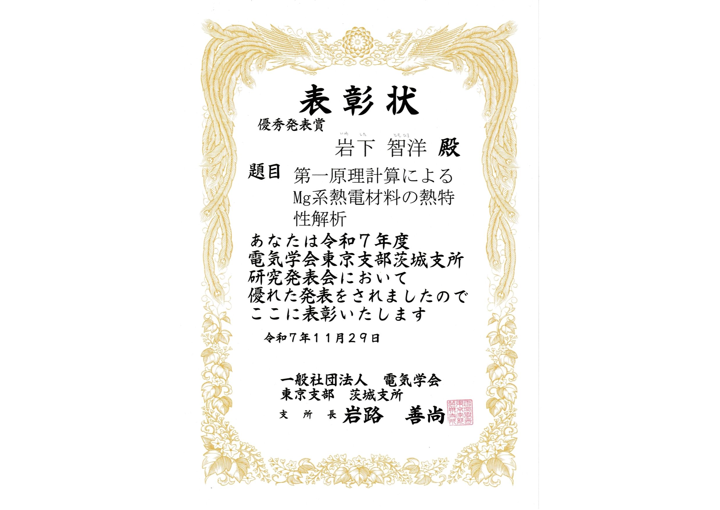 優秀発表賞(ポスター発表部門)"第一原理計算によるMg系熱電材料の熱特性解析" 岩下智洋(岩下智洋,鮎川瞭仁,切通望,鵜殿治彦,坂根駿也) 令和7年度 第33回 茨城支所 研究発表会 |